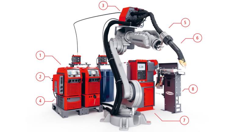 The TPS/i TWIN Push welding system consists of two powerful TPS/i welding systems(1), the TWIN Controller (2), a compact wirefeeder (3), a cooling system (4), hosepacks (5), and the TWIN welding torch (6). The Robacta TSS/i TorchServiceStation (7) for cleaning welding torches and the TX TWIN welding torch change station (8) complete the System.