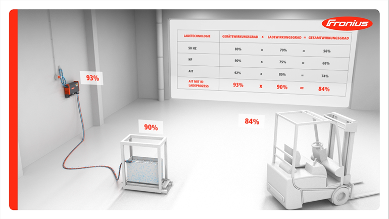 在单独使用RI充电工艺进行充电时,伏能士Selectiva电池充电器的整体效率高达84%。这不仅可以让您更有效地为电池充电,还可以减少电池损坏,从而降低维护成本。通过这种温和的充电工艺,可以避免过度充电,过渡充电会导致更快的电池污染、更多的水消耗和危险的氢氧的产生。