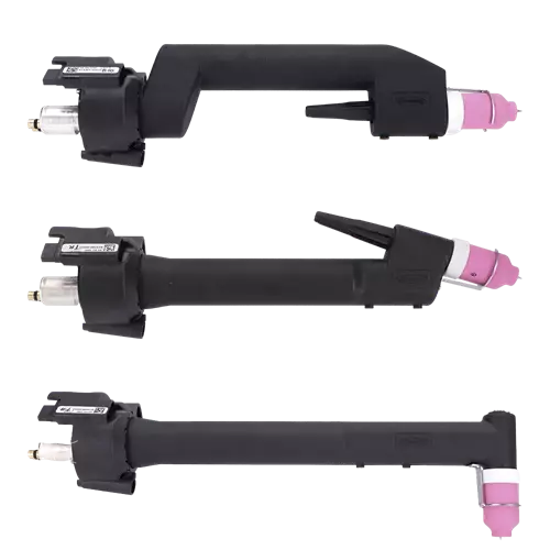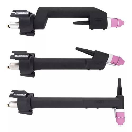 水冷 TIG 枪颈有两种不同的功率类别 (450 A/500 A) 和四种不同的几何形状 (0°/17°/70°/90°)。